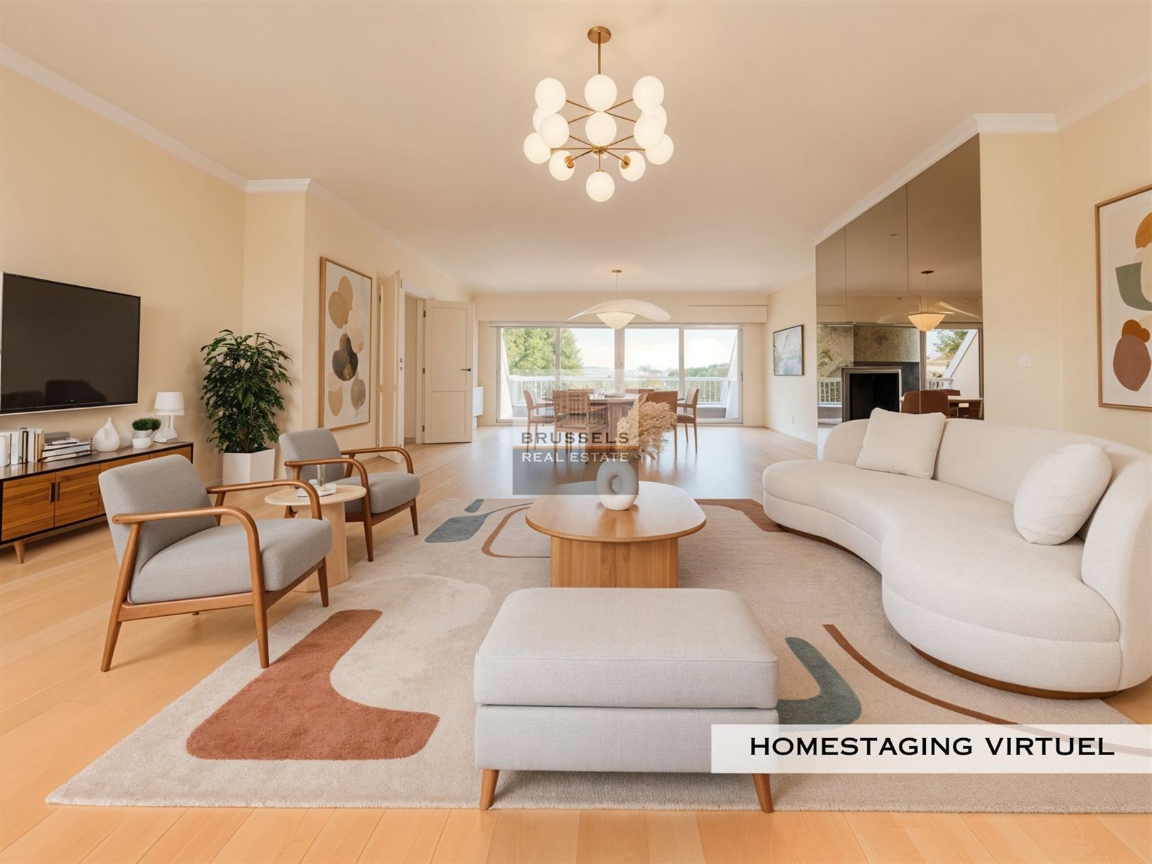 Beautiful, spacious and bright penthouse flat with south-facing terrace overlooking the private park. The property includes an entrance hall with armoured door and cloakroom - visitor's toilet - The lounge and dining room share the living area with a large bay window giving access to the terrace. A working open fireplace completes the room. - Flooring: original solid oak herringbone parquet. The fully-equipped kitchen includes a breakfast area and access to the terrace. The night hall leads to the three bedrooms and bath/shower rooms. Two large bedrooms of around 15 m2 and a smaller one of around 10 m2. The bathroom and shower room were both renovated in 2016.The flat also benefits from a cellar and a garage with a ceiling height of +/- 4 m, providing a large "attic/mezzanine" storage space, secured by an alarm and an electric door.With regard to the co-ownership, the entire building underwent major energy renovation in 2018 (17 cm roof insulation and 14 cm facade insulation). The building has a common laundry room equipped with new, high-performance machines, a private park and a playground, as well as the services of a concierge. PEB C - Electricity in compliance.
