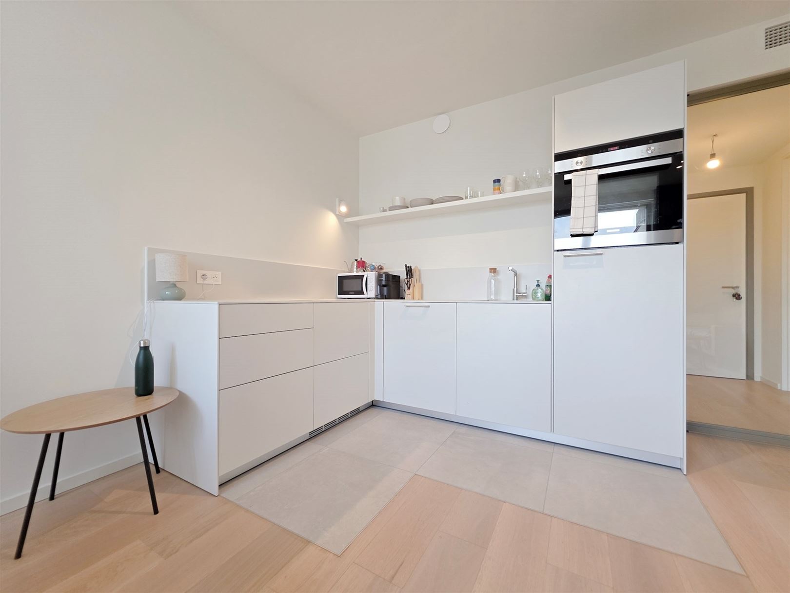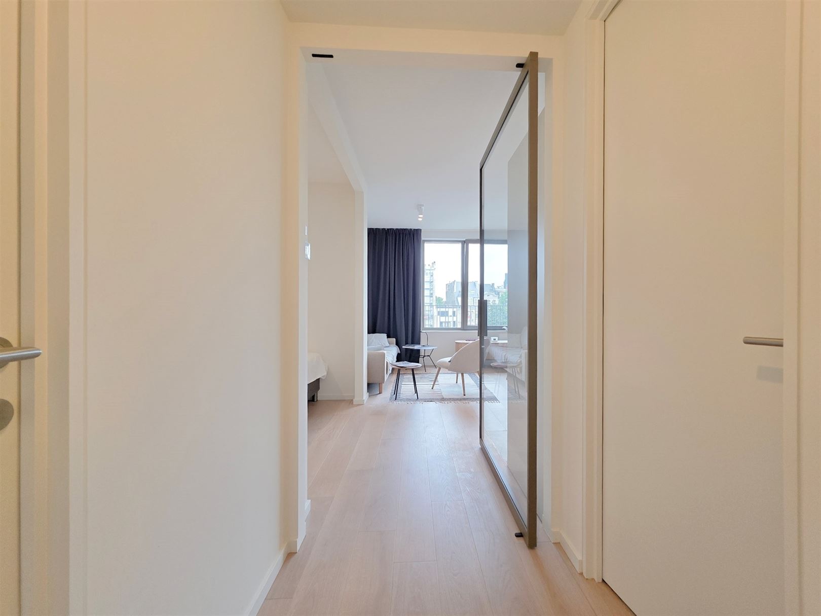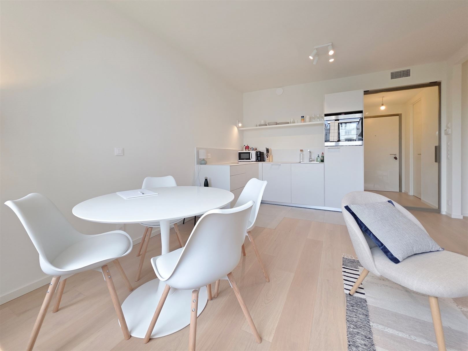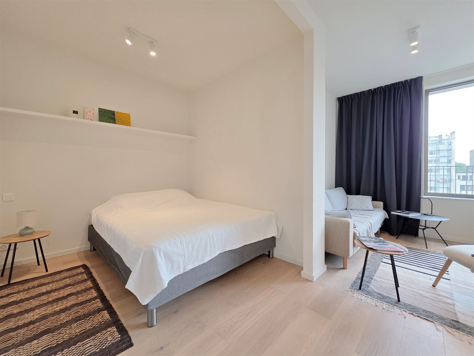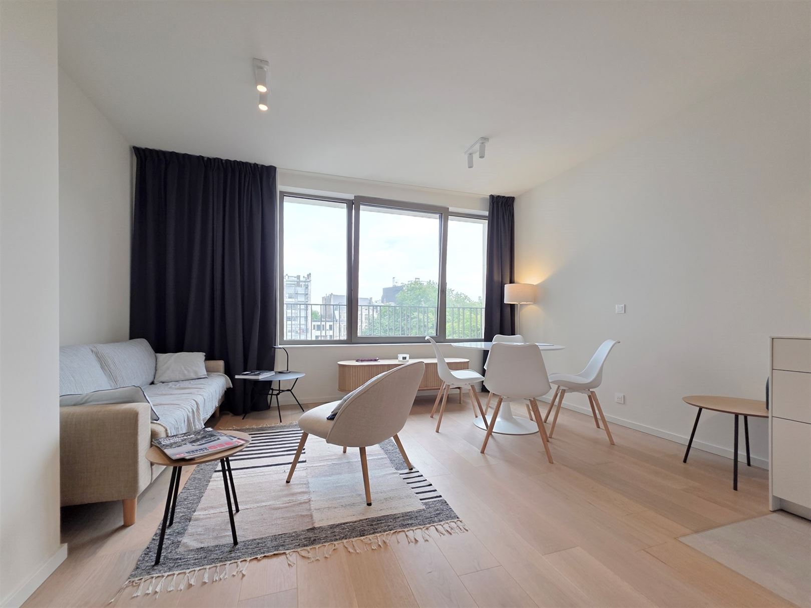 Montgomery- Mérode, close to the magnificent Parc de Woluwe and the European Community. Résidence Tervuren Square: brand-new, furnished 50m2 studio with bedroom and built-in wardrobe - bright living room with super-equipped kitchen - shower room - utility room with washing machine and dryer - cellar - secure, easy-access parking space for motorcycles - bike room. General underfloor heating and cooling- Iindividual double-flow ventilation, home automation - Secure entrance doors, intelligent cabinets for parcel delivery and a building design that ensures sound and vibration insulation. PEB A- . Charges: 60 € (common areas, hot water and heating).