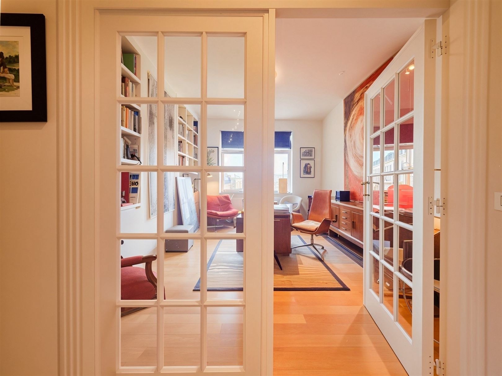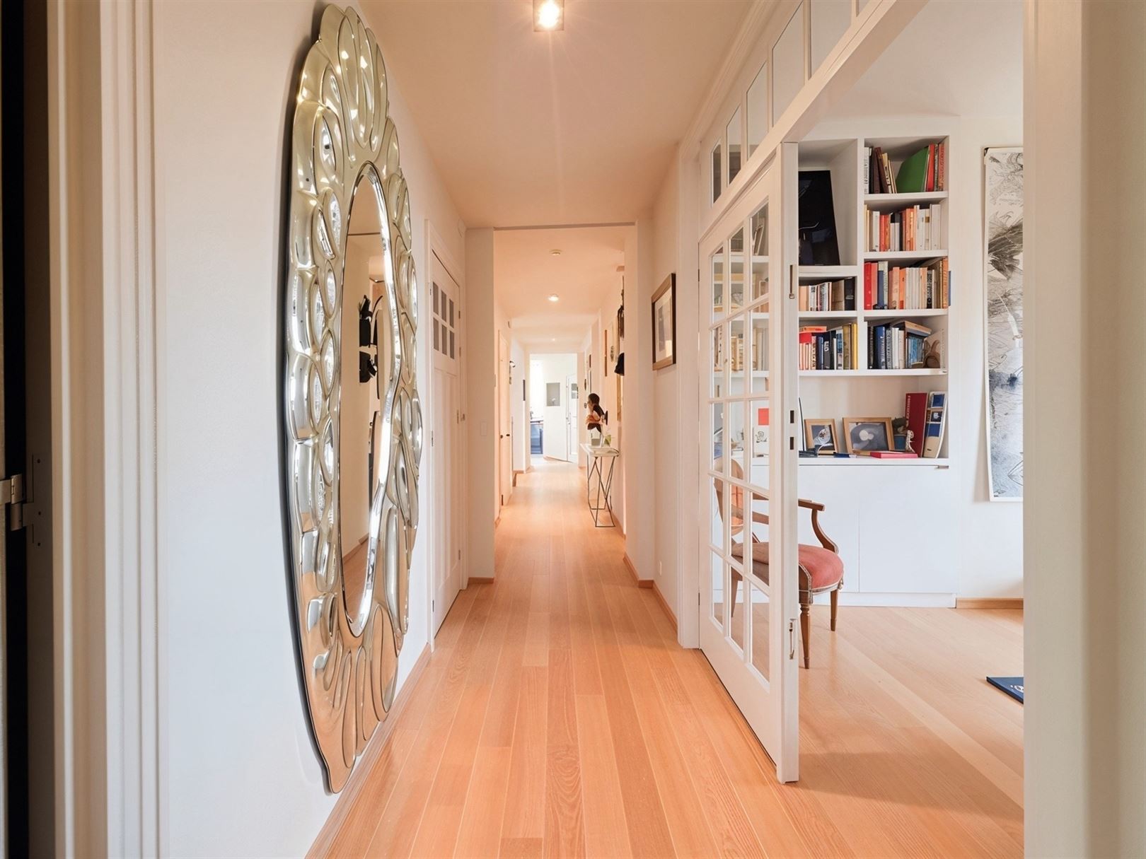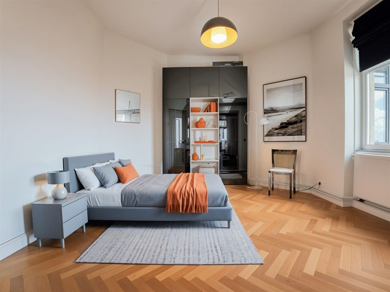 Close to Place Stéphanie and the Châtelain district – Exceptional apartment of approximately 265 m² spread over two levels, offering 5 bedrooms and an office in a warm Art Deco atmosphere. On the main level (4th floor): Entrance hall with cloakroom – Bright and spacious living room with large south-facing bay windows providing abundant natural light – Parquet flooring – High-tech open fireplace – Fully equipped dining kitchen – Office/library – Two bedrooms with walk-in closets – One bathroom and one shower room. On the upper level: Two additional bedrooms and a large office featuring an elegant decorative fireplace – Second bathroom with shower cabin. A haven of light and tranquility. Energy rating (PEB): C-. Brussels Real Estate - information & visit: info@brusselsrealestate.eu / +32.2.534.24.52