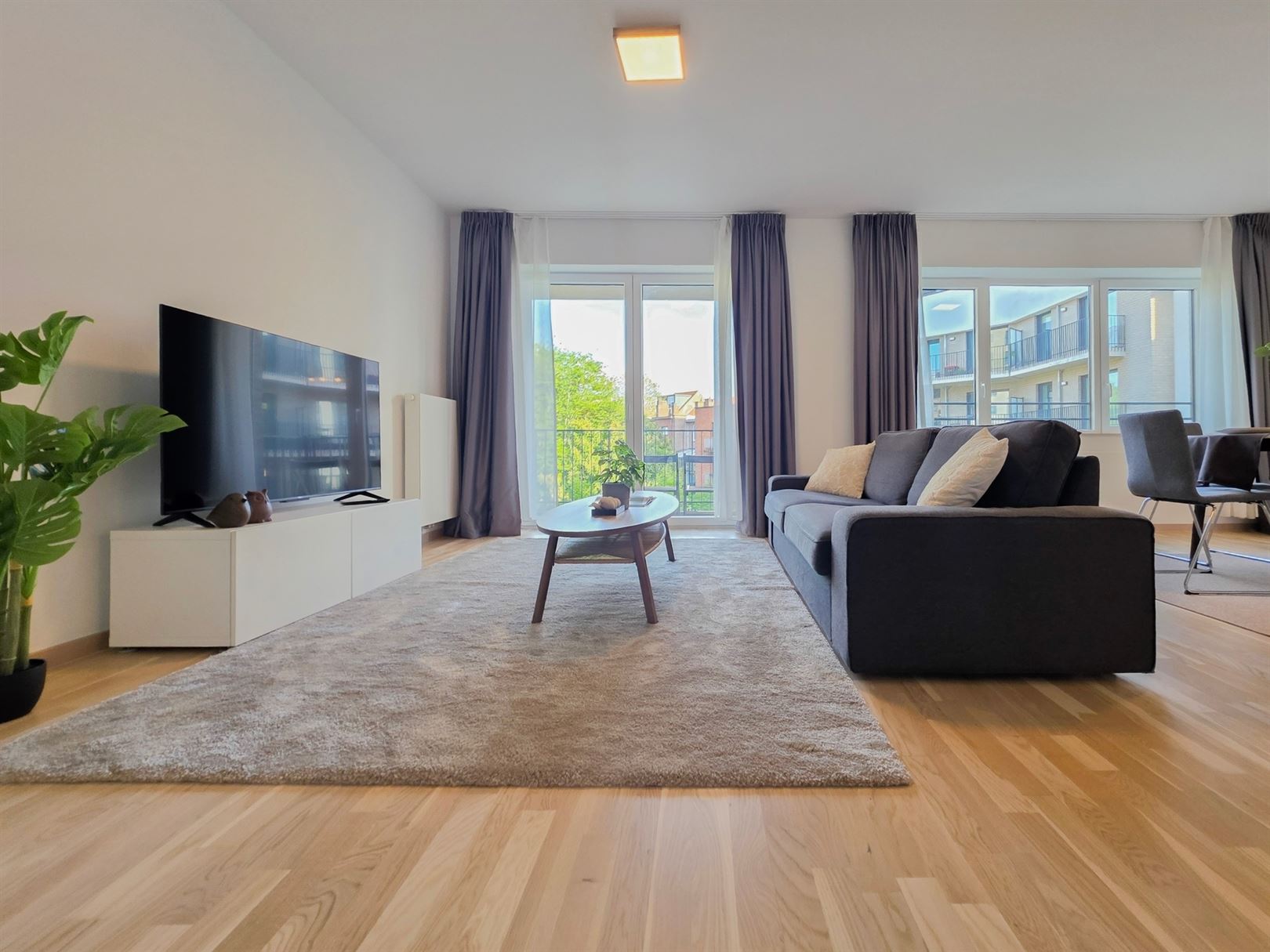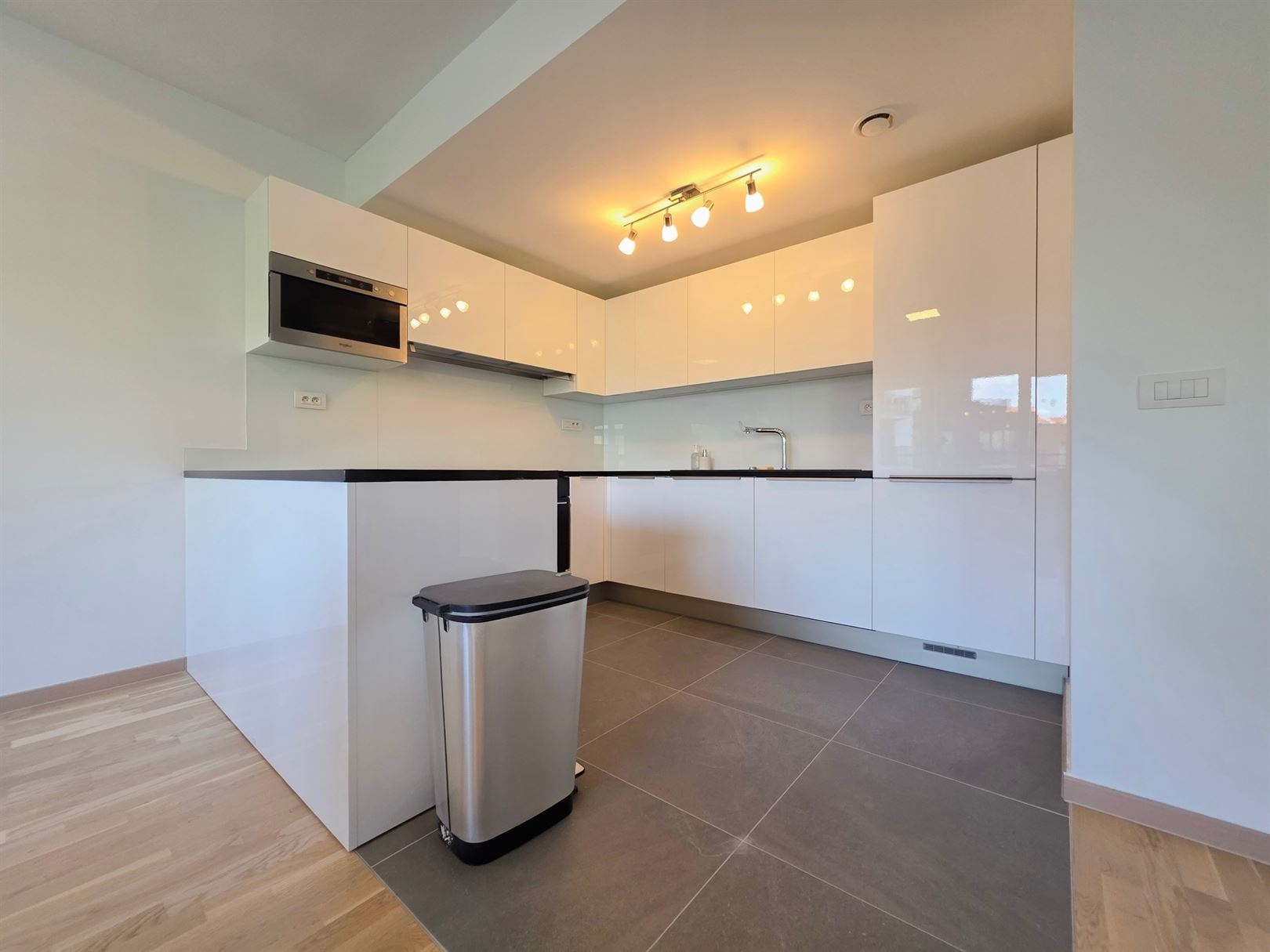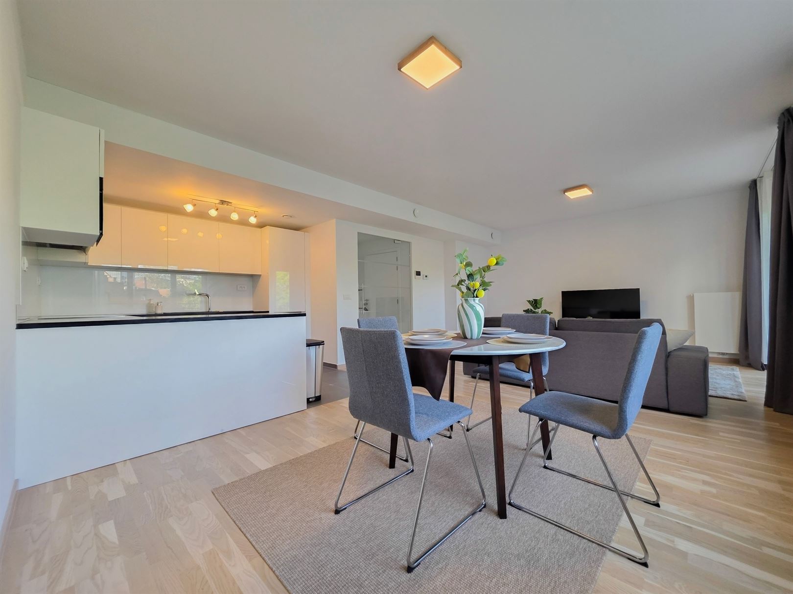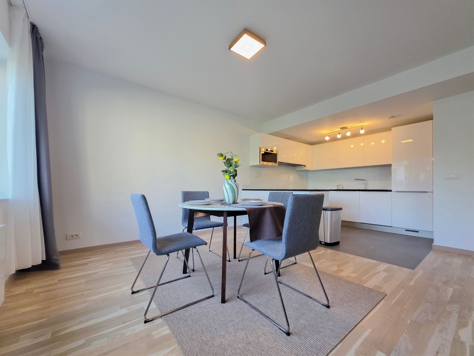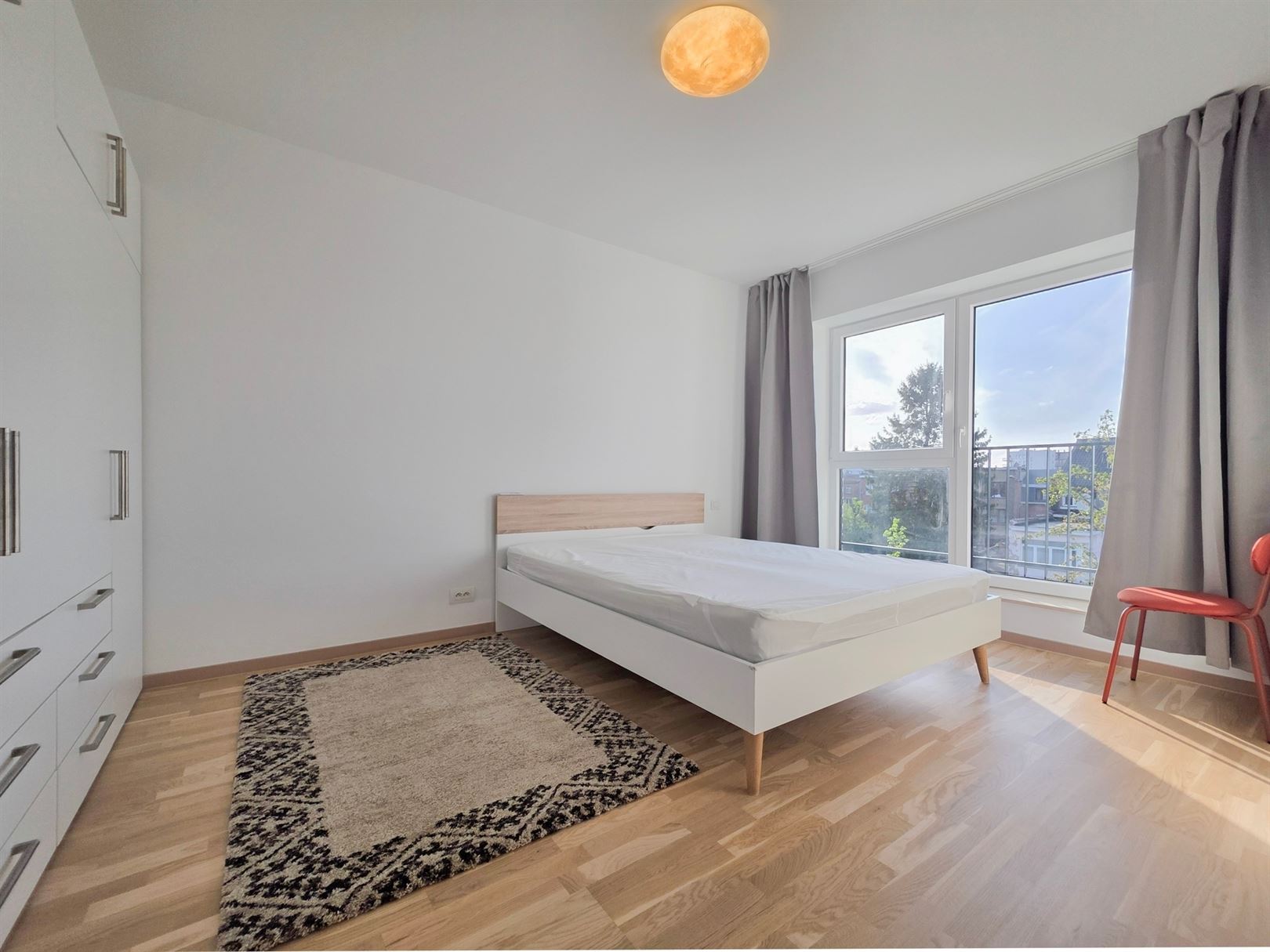 EVERE - Close to NATO – Within a private residential enclave - Beautiful furnished apartment with terrace composed as follows: Entrance hall – Bright living room with access to a pleasant south-east facing terrace - High-end, fully equipped kitchen – Spacious bedroom +/- 15 sqm with built-in wardrobe – second bedroom or office +/- 10 sqm – Bathroom with separate shower –Equipped laundry room – Cellar - Parking space available for 100 €. Key features: EPC A – Double-flow ventilation system (Zehnder) – Individual gas heating (Bulex) – Videophone – Reinforced security door – Access control system – Private communal garden. Provision for common charges: 150€/month. Individual charges: electricity, heating, water and liability insurance. (This description is provided for information purposes only and is non-contractual.)