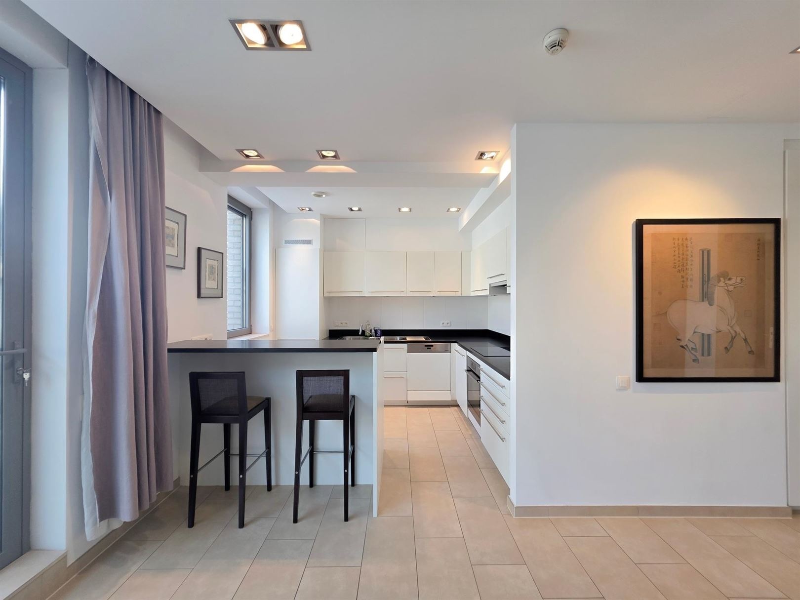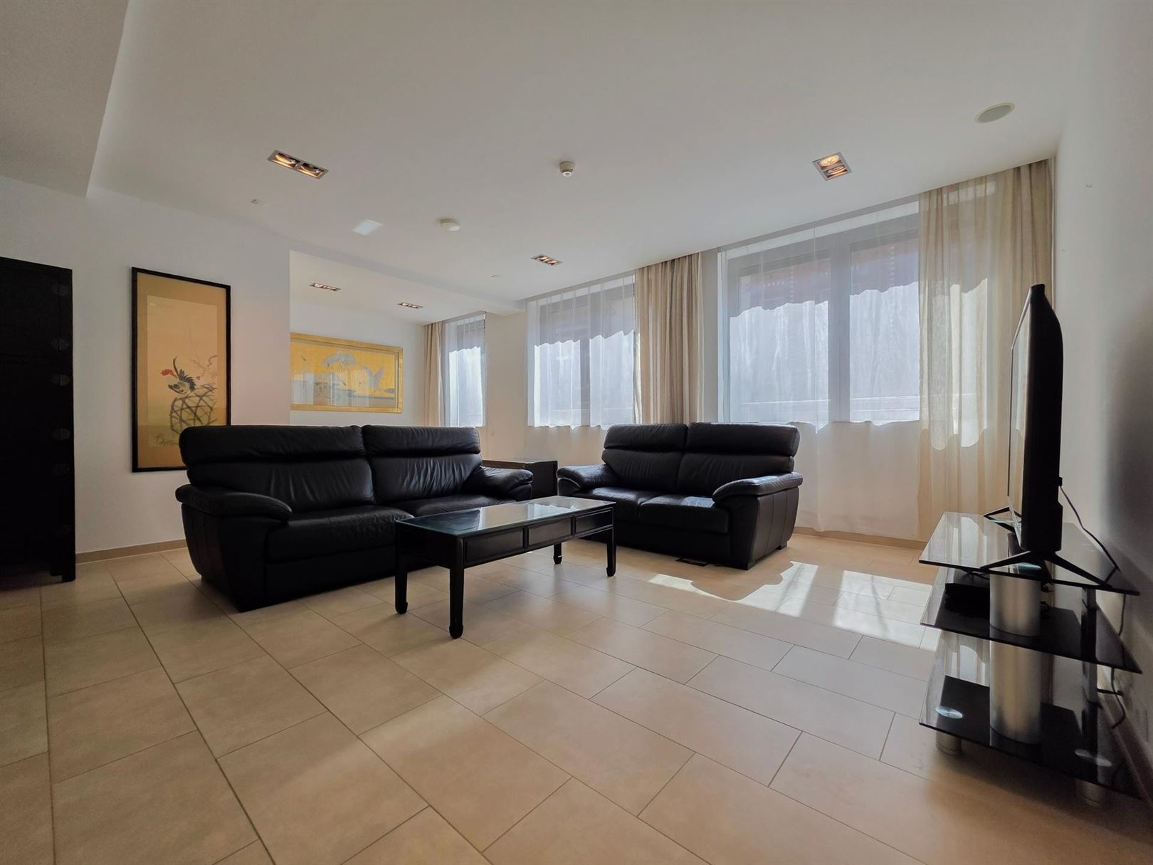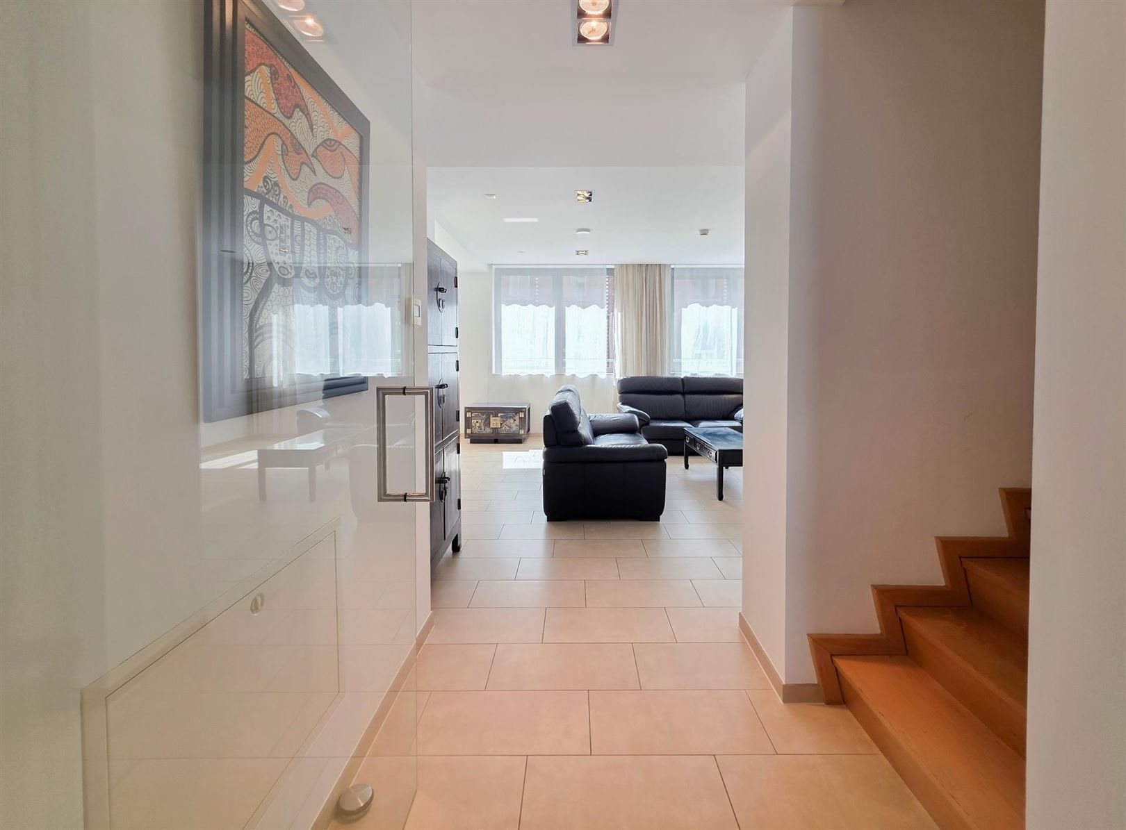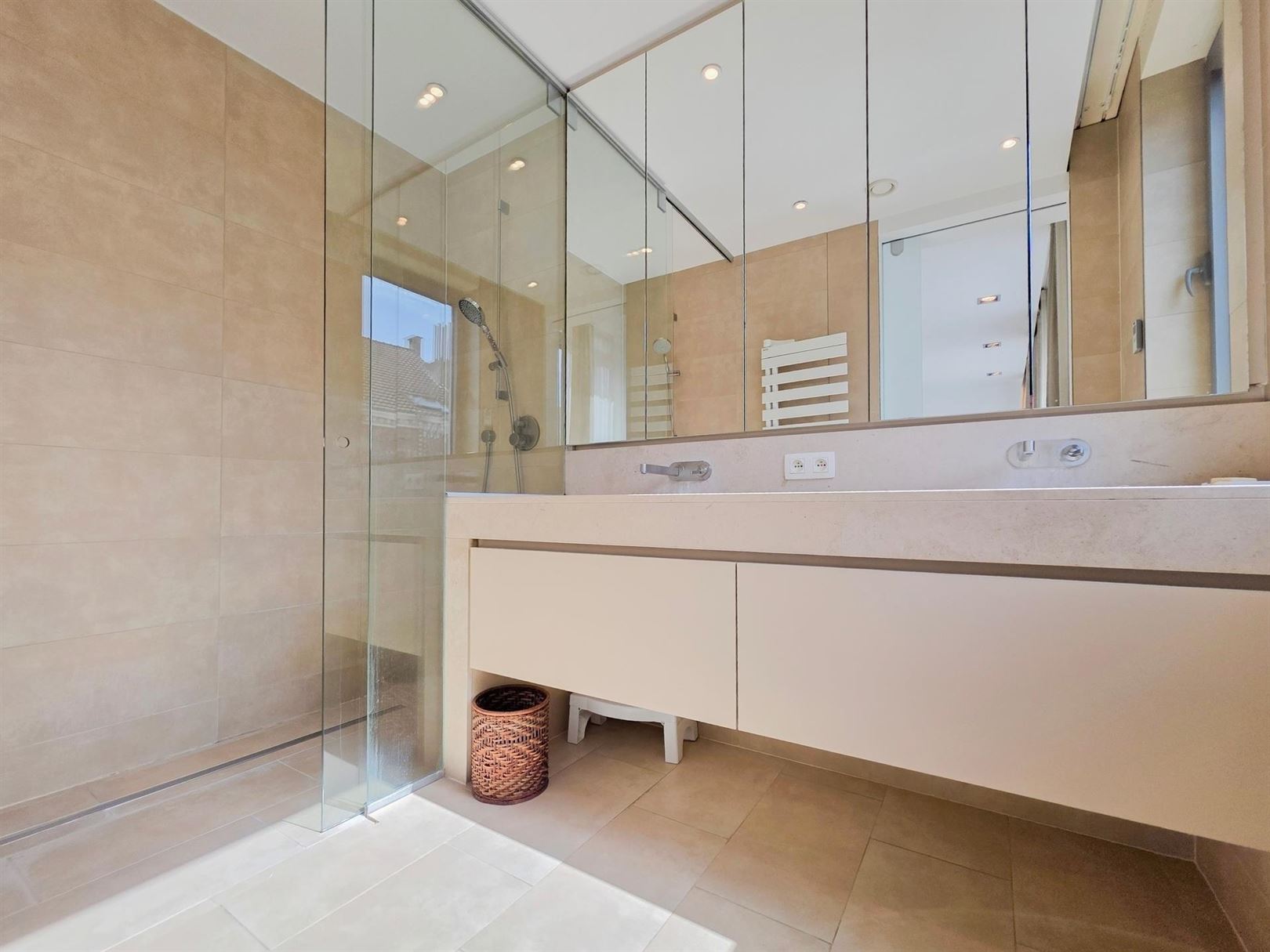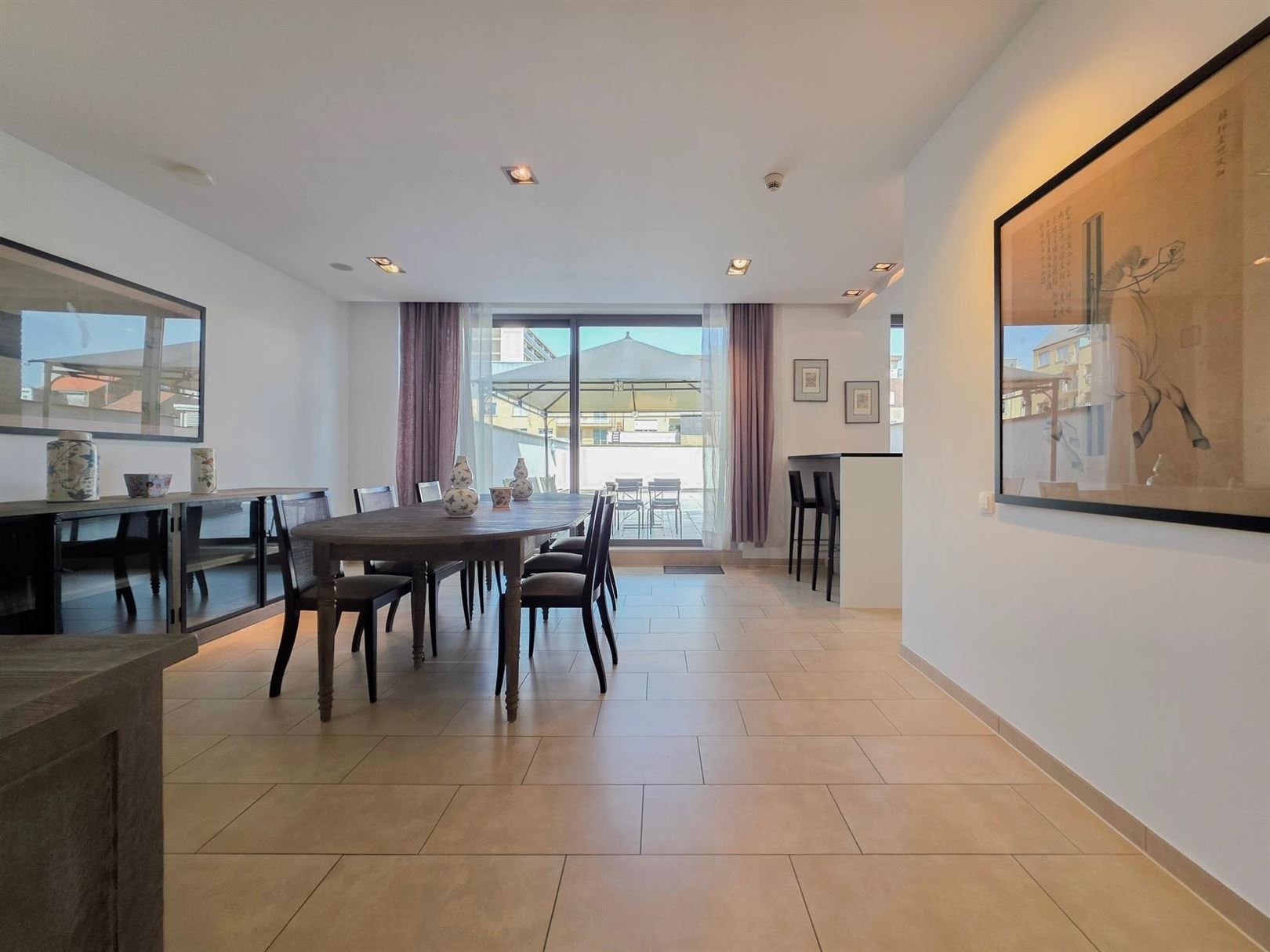 In the immediate vicinity of the European Quarter – Place Jourdan – Parc Léopold. A furnished duplex penthouse apartment of approx. 200 m² with a terrace of approx. 100 m². Ground floor: An entrance hall with cloakroom leads to a spacious and bright living room extending onto the terrace. Dining room opening onto a fully equipped kitchen. Upstairs: the sleeping area comprises a master bedroom with dressing room and en-suite bathroom, a second bedroom with shower room, and a separate toilet. A third guest bedroom or study – Garage included on the ground floor. Features: secure residence, underfloor heating, electric shutters, concierge. This property benefits from numerous built-in cupboards and an excellent energy performance rating of PEB B- (currently being renewed). Service charges: €155/month comprising: €75 flat rate for communal areas and €80 provision for heating and hot water.